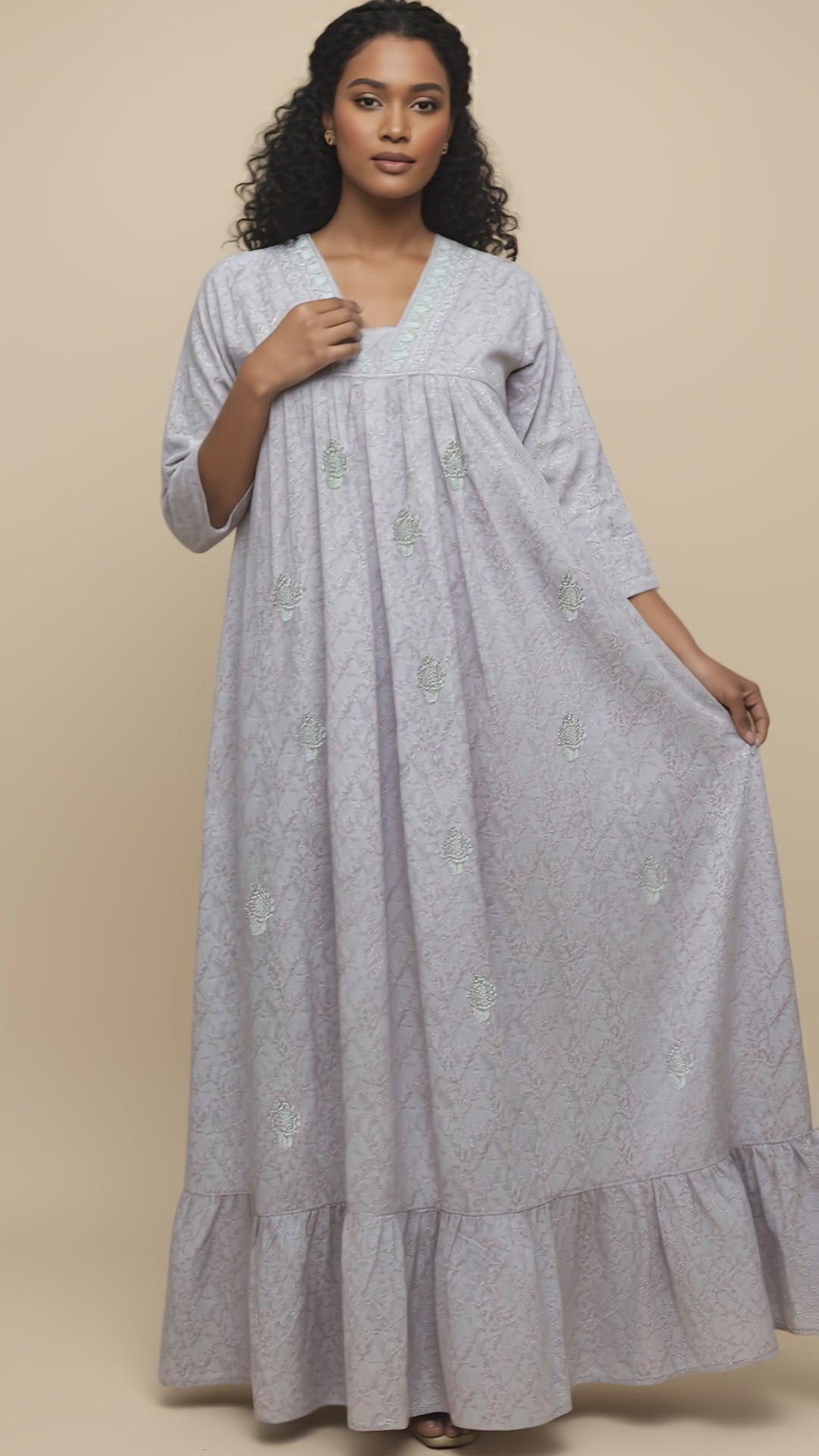 This elegant kaftan features a soft grey with a delicate floral print that adds a touch of charm and freshness. Made from breathable and lightweight cotton, it feels smooth on the skin and ensures all-day comfort in every season. The design includes fine thread embroidery, a lace-detailed V-neckline, front pleats and a wide gathered hem, giving the kaftan a graceful and relaxed look. Perfect for customers who love comfortable, stylish, and modest everyday wear.
