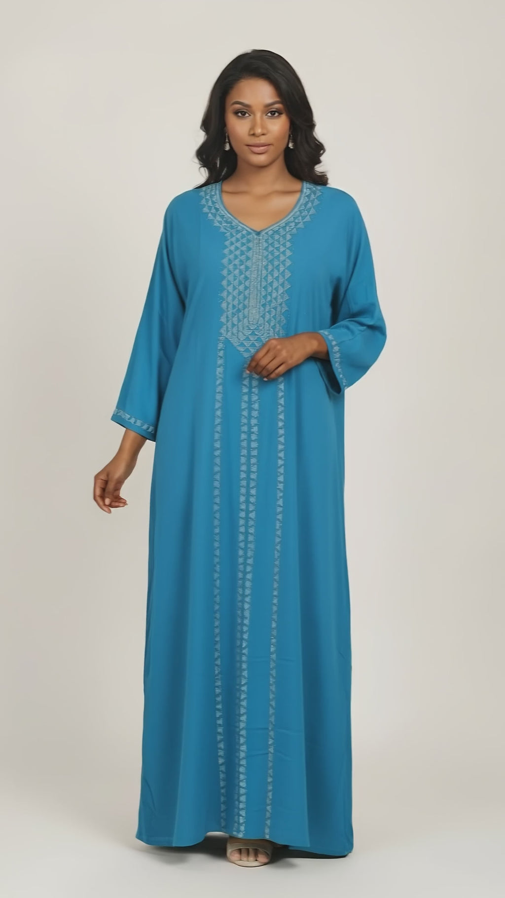 Crafted in soft and breathable rayon, this elegant kaftan features a blue hue with refined vertical stone detailing for a sleek, elongating effect. The V-shaped neckline is accented with subtle geometric stone work, adding understated sparkle. Finished with relaxed sleeves and a straight, flowy silhouette, it offers effortless comfort and timeless casual elegance.